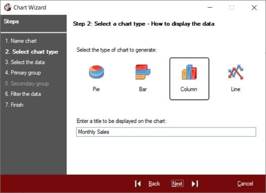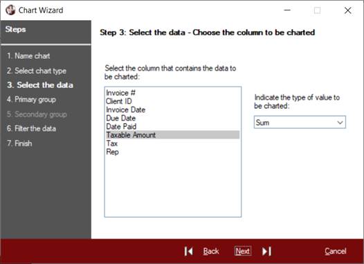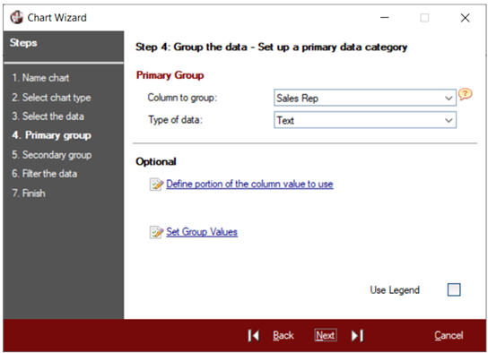 When charting sums, averages, maximum and minimum values, a primary group will need to be set up (in Step 4) to determine against which column the sum, average, etc. will be applied. When charting actual values, a primary group is optional.