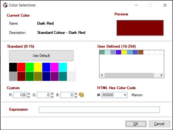 The Color Selections window presents different formats for specifying a color or creating a custom color. The color format may be a predefined system color, an RGB setting, HTML Hex color codes, a user defined color or a string expression.