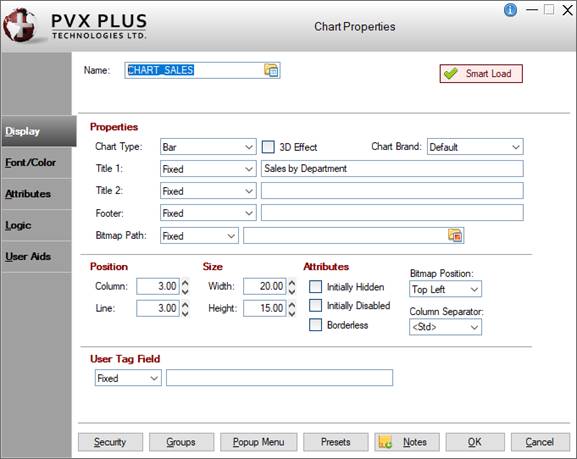 This dialogue is divided into the following tabbed panels for viewing and/or changing Chart properties: Display, Font/Color, Attributes, Logic and User Aids.