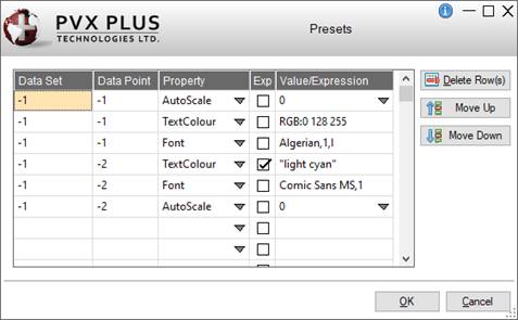 The Presets dialogue allows you to define a maximum of 999 preset records, consisting of data set, data point, property and value.
