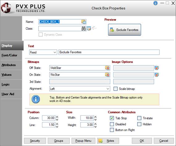 This dialogue is divided into the following tabbed panels for viewing and/or changing Check Box properties: Display, Font/Color, Attributes, Values, Logic and User Aid.