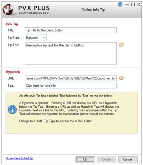 (HTML Tip) This hyperlink button is used to check the appearance and functionality of the tip as the user will see it. To test the tip before saving it, click this button to first update the tip with any changes. Then, test the tip by hovering the mouse pointer over this button. (The Press/Hover hyperlink button for HTML tips was added in PxPlus 2017.) | ||||||||||
