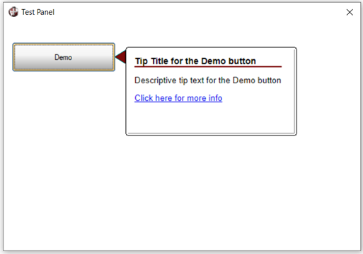 Below are examples of a Standard tip and an HTML tip defined with an optional hyperlink in the Define Info Tip dialog for a Button control. When the mouse pointer is positioned over the Button control (in the Test Panel below), the floating tip with the hyperlink is displayed.