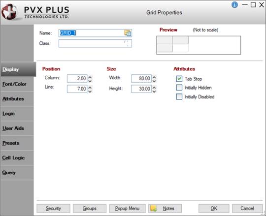 This dialogue is divided into the following tabbed panels for viewing and/or changing Grid properties: Display, Font/Color, Attributes, Logic, User Aids, Presets, Cell Logic and Query.