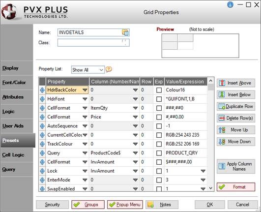 Set up attributes that will be assigned to columns, rows or individual cells. See Presets Definition. For a list of available properties that can be applied to the entire grid, a cell, column or row, see Grid Properties. (New Grid preset functionality and usability enhancements were added in PxPlus 2019.) | ||||||||||||||||||||||||||||||