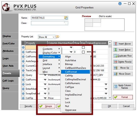 Button that launches the Grid Format Definition dialogue for defining grid columns, including Title, Width, Alignment, Cell Type, Column Name and Column Separator. (The Format button was added to the Presets tab in PxPlus 2019.) | ||||||||||||