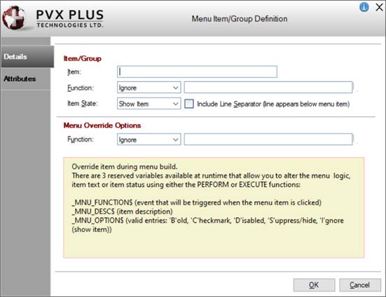 The Menu Item/Group Definition dialogue is used to define the properties of a new item or group. It is invoked from the Menu Bar Definition dialogue by clicking the New Item or New Group toolbar buttons or by right clicking inside the Item list box and selecting New Item or New Group.
