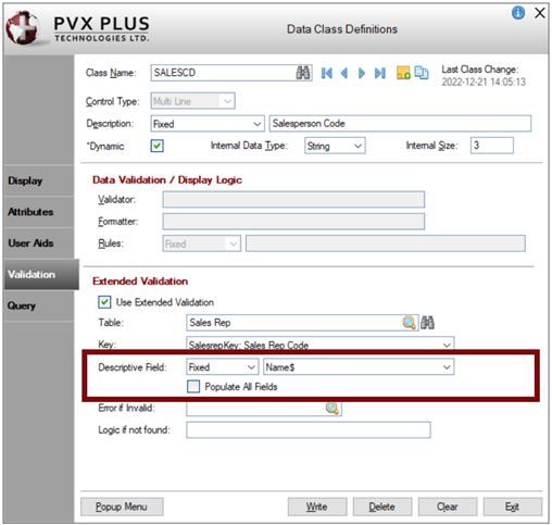 Click the drop-down arrow for a list of Multi-Line controls (on the current panel) that have an Extended Validation data class with a Descriptive Field selected. | ||||