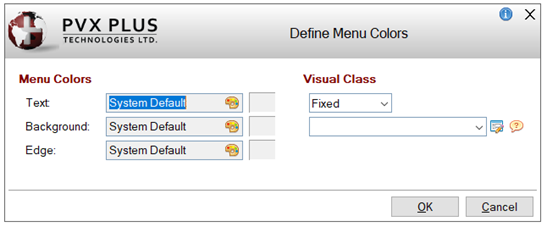 (NOMADS Only) Click this button to invoke the Define Menu Colors dialogue to define menu colors specific to this menu. (The Menu Colors button was added in PxPlus 2024.) See Menu Colors to determine how to define colors and how the various colors are applied at run time. This dialogue consists of the following: