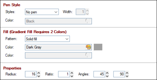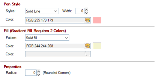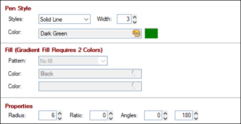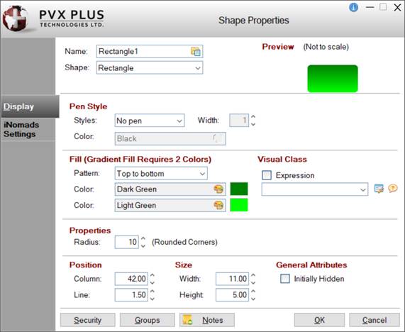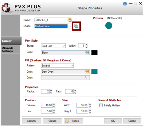 Depending on the Shape selected, the properties available on the Display tab will vary, and Fill properties are not applicable for Arc, Radius Arc, Line and Poly Line shapes. All other properties are identical across all shape types.