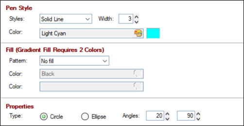 As of PxPlus 2019, the Arc, Circle, Line and Pie shape objects were redesigned to make it easier to create and select the shape, define display properties and determine the size of the shape by using the object's width and height. For compatibility purposes, the former formats of these objects have been renamed to Radius Arc, Radius Circle, Poly Line and Radius Pie respectively and continue to function as they did previously.