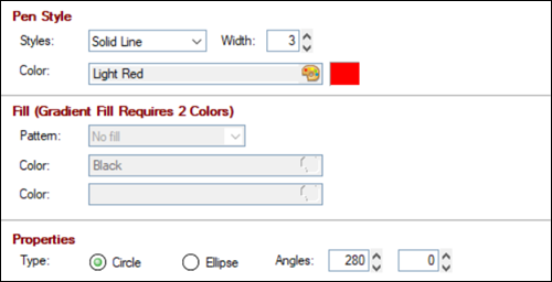 Angles (in degrees) measured counter clockwise from the right-center (3 o'clock) position of the arc circle to the starting and ending points of the arc. Valid entries are 0 - 360. | |