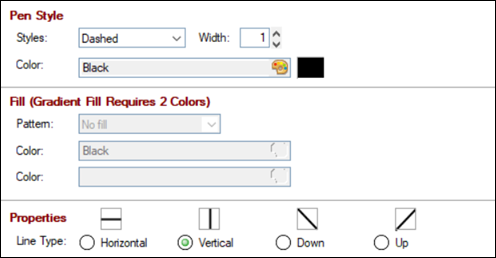 Click the drop-down arrow for a list of pen styles. The styles Dashed, Dotted, Dash-dot and Dash-dot-dot work only when the Pen Width is 1. |