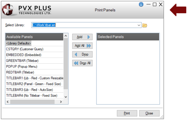 Special control names are available, which are listed below, to process the minimize, maximize/restore, close, and system menu buttons, as well as a special Fonted Text control name to display the panel caption. When the specified names are used for the buttons, they will be processed automatically by the system, which supplies the logic to process them and determines which of the buttons should be hidden/shown/enabled/disabled based on the settings for the current panel being displayed.