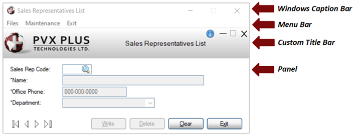 If a standard Windows title bar with a caption is used, this will be displayed at the very top of the panel, followed by the menu bar (if one has been defined for the current panel), followed by the custom title bar, and finally, the contents of the current panel.