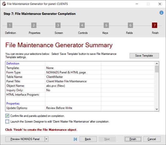 Review the selections for the previous steps, which are presented in a grid format with a vertical scroll bar. At this point, the Finish button is enabled on all panels in the File Maintenance Generator.