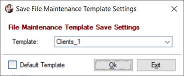 Button that launches the File Maintenance Template Save Settings window for saving File Maintenance template settings to a file name. Saving them to a file name allows the same settings to be used again when defining new panels by selecting the desired Template in Step 1: Definition. Using File Maintenance templates makes it easier to maintain a consistent look and feel to panels that are generated. This window consists of the following: