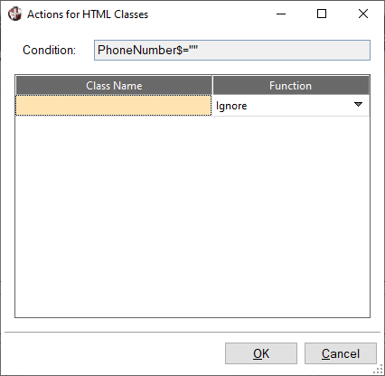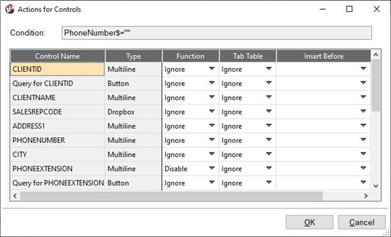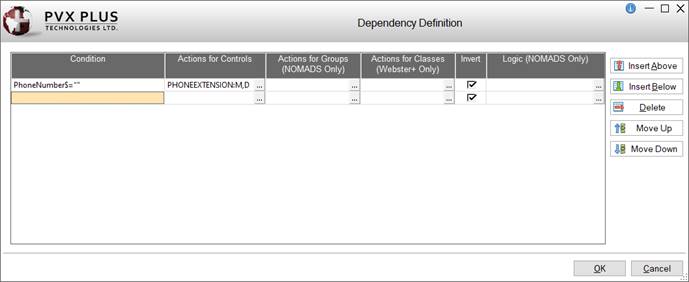 Each dependency definition created in the table will consist of a conditional expression, as well as one or more actions and/or logic to be performed when the Condition is true.