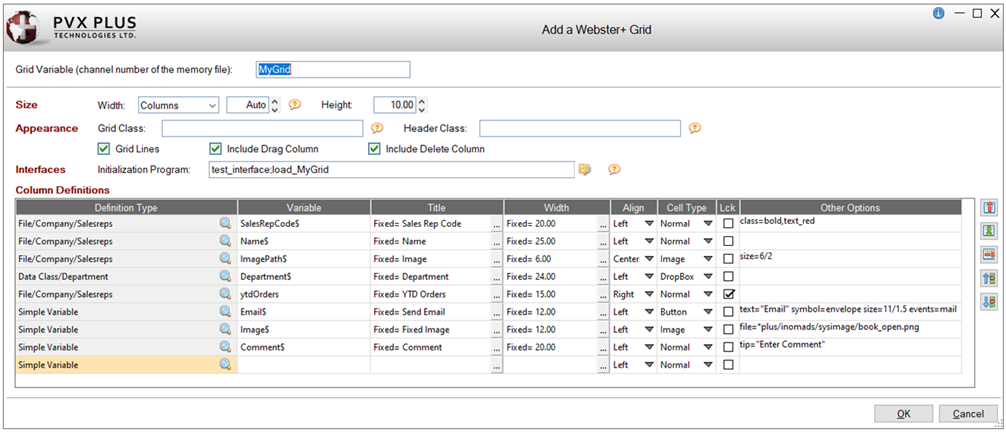The Add a Webster+ Grid window is used to add (and edit) a Grid control on the file maintenance HTML page only. It is not available for file maintenance NOMADS panels.