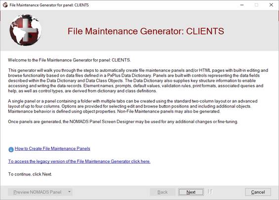 To access the legacy version of the File Maintenance Generator click here link launches the legacy version of the File Maintenance Generator.