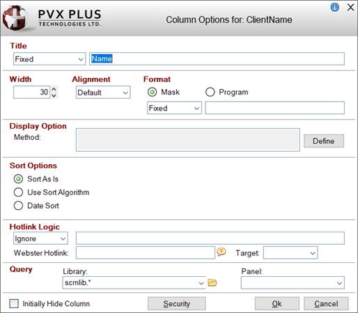Select this option to initially hide the column at run time until the user selects it to be shown. When using Query+ Toolbar, Hybrid, Menu or Drop Query views (see Query View option), columns can be set to be initially hidden or shown by clicking the Test/Design toolbar button to display the query and selecting the Show/Hide/Reorder Columns item from the Columns run-time option to set the visibility. Click the Save + Exit button to save and incorporate these settings into the query definition when exiting the query. (The ability to save query changes when in Test/Design mode was added in PxPlus 2023 Update 1.) | ||||||||||