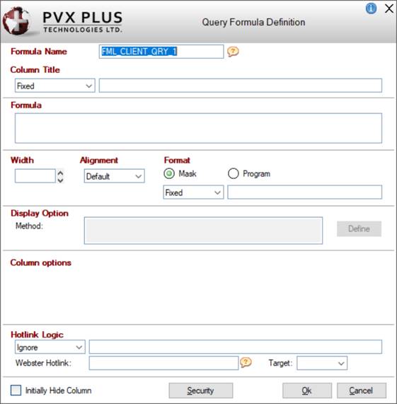 Selecting this check box initially hides the formula column at run time until the user selects it to be shown. When using Query+ Toolbar, Hybrid, Menu or Drop Query views, columns can be set to be initially hidden or shown by clicking the Test/Design toolbar button to display the query and selecting the Show/Hide/Reorder Columns item from the Columns run-time option to set the column visibility. Click the Save + Exit button to save and incorporate these settings into the query definition when exiting the query. (The ability to save query changes when in Test/Design mode was added in PxPlus 2023 Update 1.) | ||||||||||