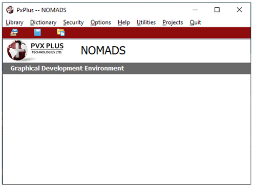 To get started on a graphical user interface development project in NOMADS, invoke the NOMADS Session Manager by running the PxPlus program "*nomads". Run this directly from the PxPlus Command line either by entering RUN "*nomads" or by simply entering nom. You can also use a shortcut that has been set up for this purpose. During installation, PxPlus for Windows places a NOMADS shortcut under the group PVX Plus Technologies > PxPlus, which can be accessed via the Windows Start menu.