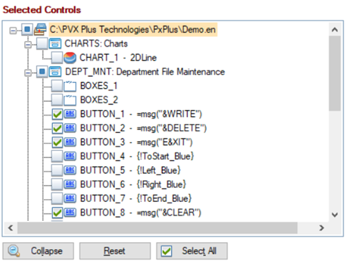 If the search criteria is based on Control Type = Panel Header, only library and panel nodes are loaded into the Selected Controls tree view list box. If the search criteria is based on Control Type = Library Defaults, only library nodes are loaded into the Selected Controls tree view list box. Right clicking on a panel node or control node invokes a popup menu for quick access to Library Object Selection and the NOMADS Designer. When right clicking on a library node, only the Library Object Selection option is available. (The right-click popup menu was added in PxPlus 2018.) To select all libraries/panels/controls in the tree view, click the Select All button. Note: | ||||