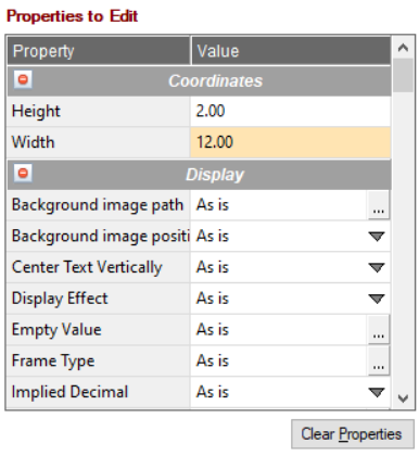 The Properties to Edit grid lists the properties for the selected Control Type and the current value of each property. Use this grid for entering the changes to be applied to selected controls. See Selected Controls. All values entered in the grid are cleared when either the Clear Properties or Clear button is selected.