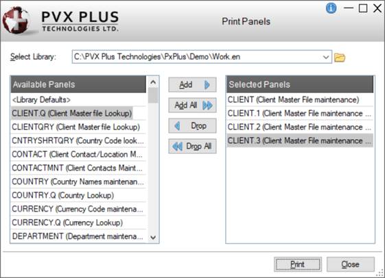 Listed panels are selected for printing. Double-click on a selected object or click the Drop button to remove. Click the Drop All button to remove all objects. |
