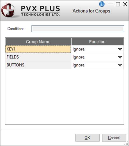 Assigns functions to be applied to selected groups when the Condition tests true. Click the dotted button to invoke the Actions for Groups window. This window consists of the following: