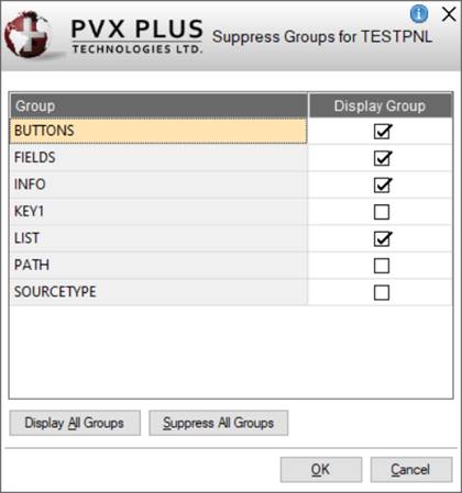 The Suppress Groups utility is used for choosing which group(s) of controls to display or temporarily suppress from displaying on the current panel in the NOMADS Panel Designer. This is particularly useful when working on a panel with overlapping controls, as suppressing a group makes it easier to access and edit other controls.