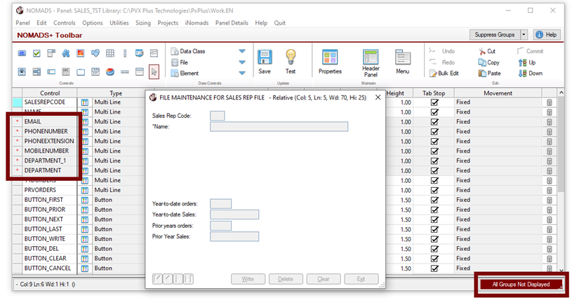 Panel controls that are associated with a suppressed group are listed in the Controls grid with a red * (asterisk) in the row header column. The entire row is also disabled, which indicates that the control is not accessible. The words "All Groups Not Displayed" (white characters on a dark red background) displays in the bottom right corner.