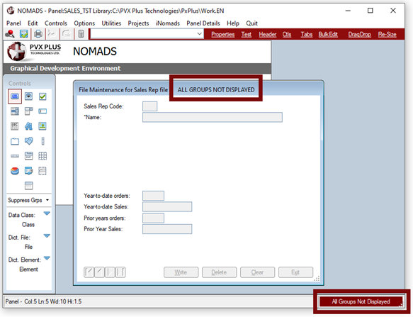 Panel controls that are associated with a suppressed group are listed in the Controls drop box in the top toolbar. When selected from the drop box, a message displays to indicate that the control is currently not displayed. The words "All Groups Not Displayed" (white characters on a dark red background) displays in the bottom right corner.