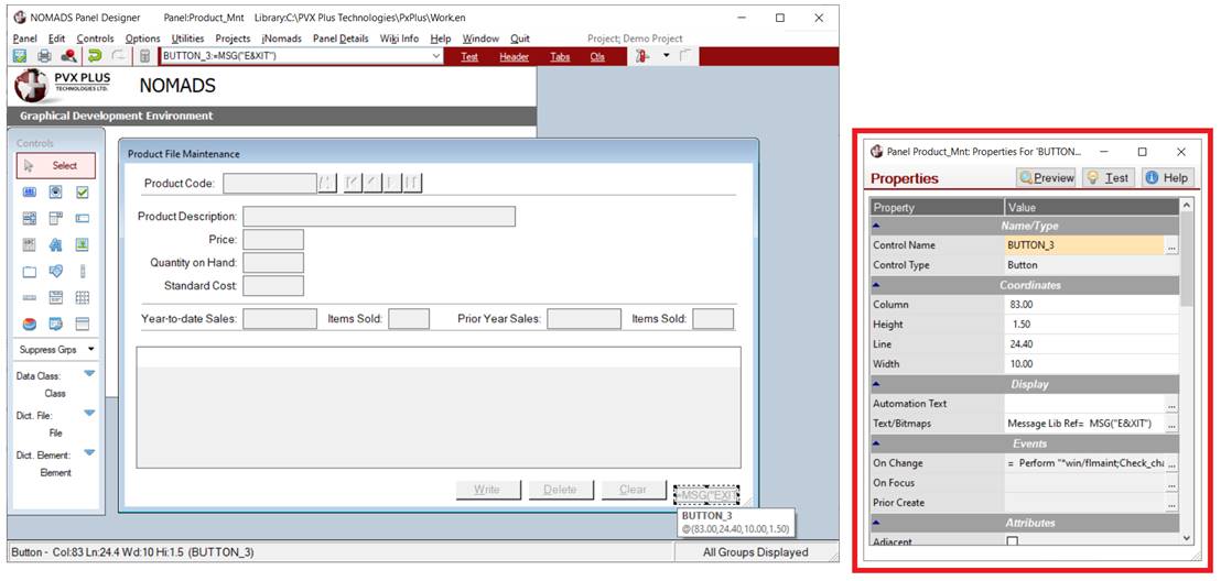 The example below shows the Property Sheets version of the NOMADS Panel Designer. On the design panel, a button control is selected, and the Button Properties for this control are displayed using the Property Sheet: