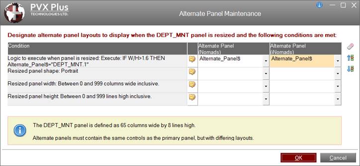 The Alternate Panel Maintenance utility allows you to specify conditions to apply when resizing the panel currently being defined in the NOMADS Panel Designer and the alternate panel to display when a condition is true. To invoke this utility, select Assign Alternate Panels from the Utilities menu in the NOMADS Panel Designer.
