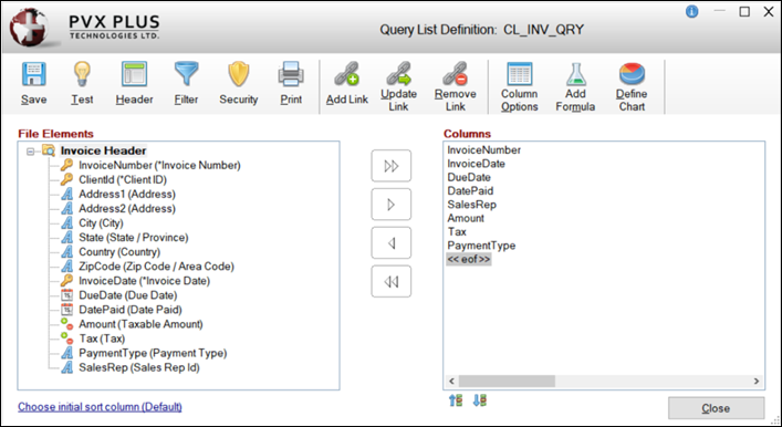 This window is identical to the Query Definition window that is used to define a Standard Query where you can set up link files, define columns, edit file information and set up selection parameters. Query Security can also be set up for the Query List. However, the query selection criteria for a Query List definition (using the Filter toolbar button) is slightly different from the Query Selection Criteria for a Standard Query. The names and values of the trigger variables are available to the Query Load logic; therefore, these variables may be used to define Prefix and Range values as opposed to the Load logic of a Standard Query that uses global variables for these values. In addition, the Prefix and Range values can be applied to the Sort By key rather than just the primary key. The trigger variables are also available in an identical set of variables with a _VAR. prefix, which allows you to build selection tests that compare the external trigger variables with the _VAR. prefix to variables in the Query definition with the same name, e.g. _VAR.GLAcct$=GLAcct$. The Choose initial sort column option is available for Smart Report View List Boxes and Grids. However, unlike a query where the sort column is implemented only on the initial load, with Smart Controls, the sort column is implemented each time the control is reloaded. (The use of _VAR. aliases for variables passed to the *winlist logic was added in PxPlus 2021.) | ||||||||||||||||||||||||||