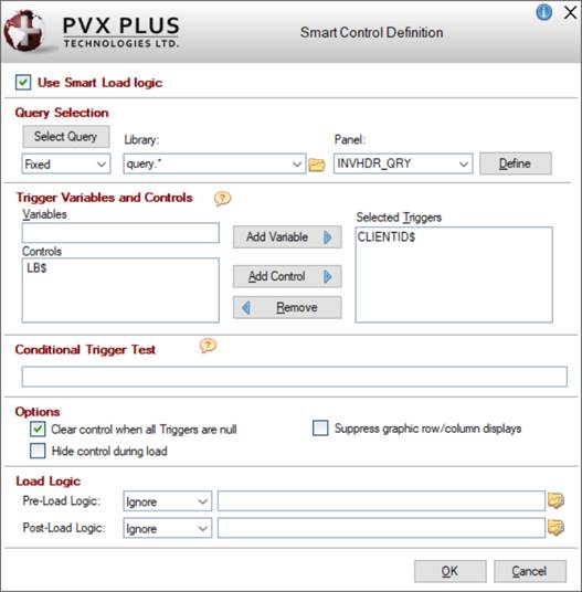 The Smart Control Definition window is used to turn on the Smart Load logic and assign a Query to the target control (List Box, Drop Box, Grid, Multi-Line or Chart) to supply the list content and formatting information. It also allows you to optionally define load-triggering criteria (trigger variables and loading conditions) for the control, as well as specify Pre- and Post-Load logic as desired.