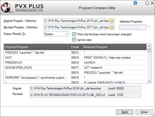 The output consists of a side-by-side listing of the Original Program and the Revised Program. Any differences (i.e. additions, deletions, changes) will be noted in the middle of the report and can be viewed by using the scroll bar. | ||||||||