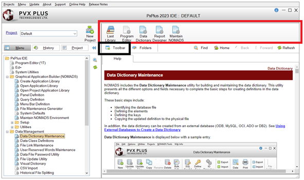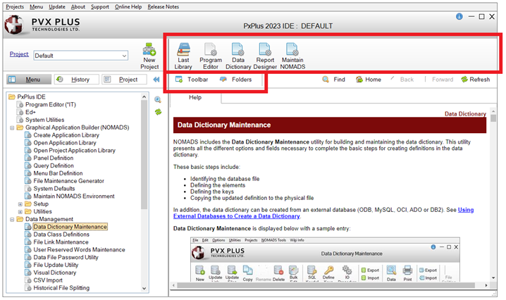 As of PxPlus 2020, the IDE Main Launcher was enhanced with Web capability and streamlined access to Menu, History and Project tasks. The ribbon toolbar can be customized with up to 10 buttons for launching commonly used tasks. This is done by using the drag-and-drop method or by right clicking on a selected task in the Menu list. Web pages (up to 10) can be added so that frequently used Web sites are just a single click away. A Find button is provided for entering specific text to search for in a displayed Web page. The IDE Main Launcher includes maintenance utilities for managing ribbon toolbar buttons and Web page tabs. A single button switches the Main Launcher to the standard IDE view, which does not include Web capability.