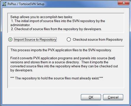 Finally, to import the application, invoke the PxPlus TortoiseSVN Setup utility from the PxPlus base window Utility menu, from the Version Control menu in the *IT - Integrated Toolkit or Ed+, or by using the SVN SETUP command program.