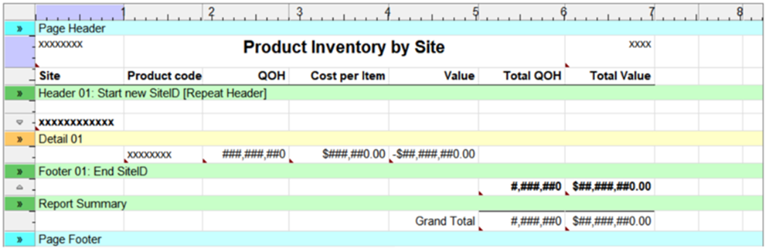 This report is grouped and sorted by Site, which is displayed in bold in the group header line. The various totals are displayed in bold in the group footer line.