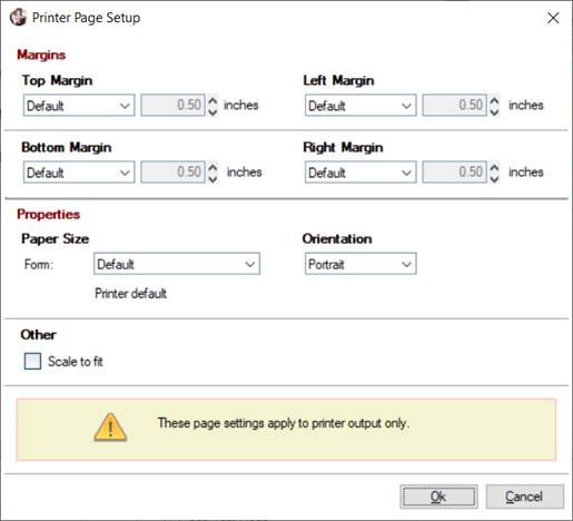 The Scale to fit option causes the column width, line height and font size to be adjusted either up or down so that the report will fit the page size. If margins are defined, they will be maintained. If margins are not defined, a one-half inch margin will be used as default. When selecting this option, be sure to select fonts that scale well.