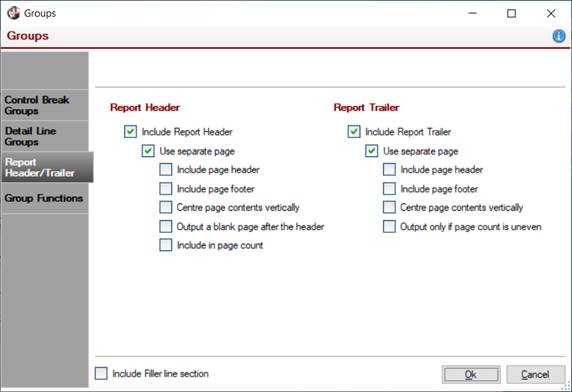 In the case of the report header, additional options are provided to output a blank page after the header (for duplex printing) and to include the header page in the page count. The report trailer also has an option to be output only if the page count is uneven (for duplex printing). If a trailer is not printed on a separate page and a filler section is defined, an option is provided to use a Filler Line to fill the gap between the last line and page bottom.