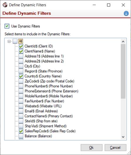 The Define Dynamic Filters window is used to set up dynamic selection criteria to filter the report. To set up dynamic filters, first select the Use Dynamic Filters check box and then select which report items are to be made available to the end user to set up filter conditions at run time.