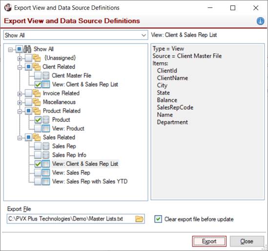 To invoke the Export View and Data Source Definitions utility, click the Export toolbar button in Data Source Maintenance. This utility is used to export data source and view definitions to a formatted text file.