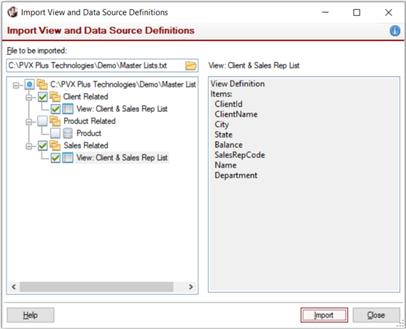 To invoke the Import View and Data Source Definitions utility, click the Import toolbar button in Data Source Maintenance. This utility is used to merge the exported data source and view definitions into a currently loaded view.