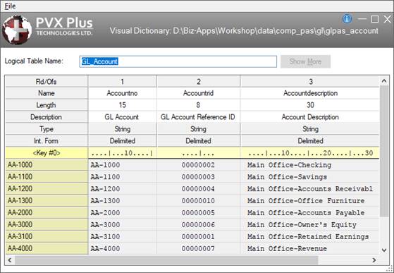When a file is opened by the Visual Dictionary™, a grid is presented with the first 25 records of the file based on what it can determine as the data dictionary layout for the file. While the actual contents of the file cannot be changed, you can change each field's name, format and description. Once changed, the new dictionary can then be written to the file and optionally loaded into the system's data dictionary.