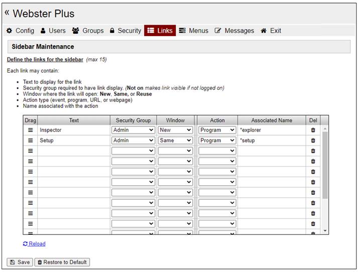 To run the Links Maintenance utility, select Links from the top menu of the Webster+ system setup. The following window is displayed: