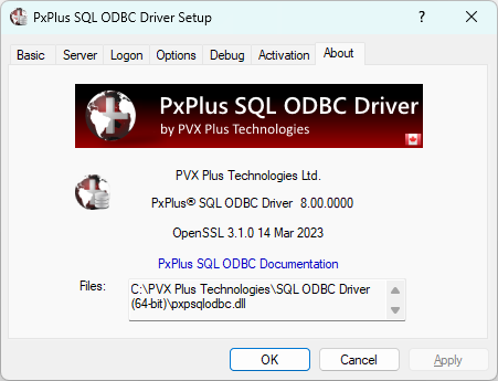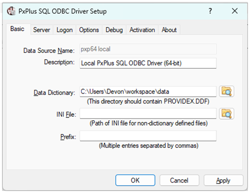 The PxPlus SQL ODBC Driver Setup dialog displays, which allows you to create and configure access to a PxPlus database. This dialog is divided into the following tabbed panels (explained below): Basic, Server, Logon, Options, Debug, Activation and About. |